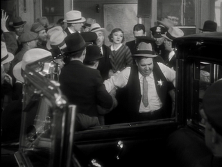 The first thing the eye is drawn to in this scene is the sheriff's white shirt; it is the brightest object in the shot and appears even brighter due to the dark areas surrounding it. The composition places the focus a little to the right of center, which helps balance the weight of the image, and the chevrons on Ellie's shirt draw the eye up to her face, and the space around her head gives her presence a greater importance in the scene, as does her placement toward the top of the image. The lighting is high key; everyone appears to be fairly evenly lit and contrast comes more from the colors of the clothing and vehicle than from the lighting decisions. The use of the long shot takes in the large crowd and shrinks Ellie, which emphasizes how lost she is in this decision to return home. It also distances us from her, just as this moment causes the distance between her and Peter. The angle is slightly downward, but very close to eye level. She is more vulnerable in this scene than she has been in most of the others, but she's still in charge of her decisions. The image is very dense and chaotic; this helps to establish the feeling that the decision to return home was made hastily within a turmoil of emotion after she found that Peter had left. The open form gives the impression that the crowd we see here is still spilling out to an unknown distance, which adds to the sense of chaos.